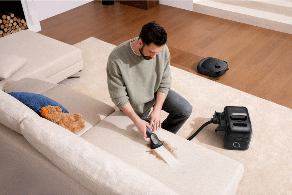 The Eufy Omni E28 tackles any mess with 20,000 Pa suction and a HydroJet self-cleaning mopping system for deep cleaning on carpets and hard floors. Its FlexiOne design includes a detachable portable deep cleaner for spot-treating stubborn stains.